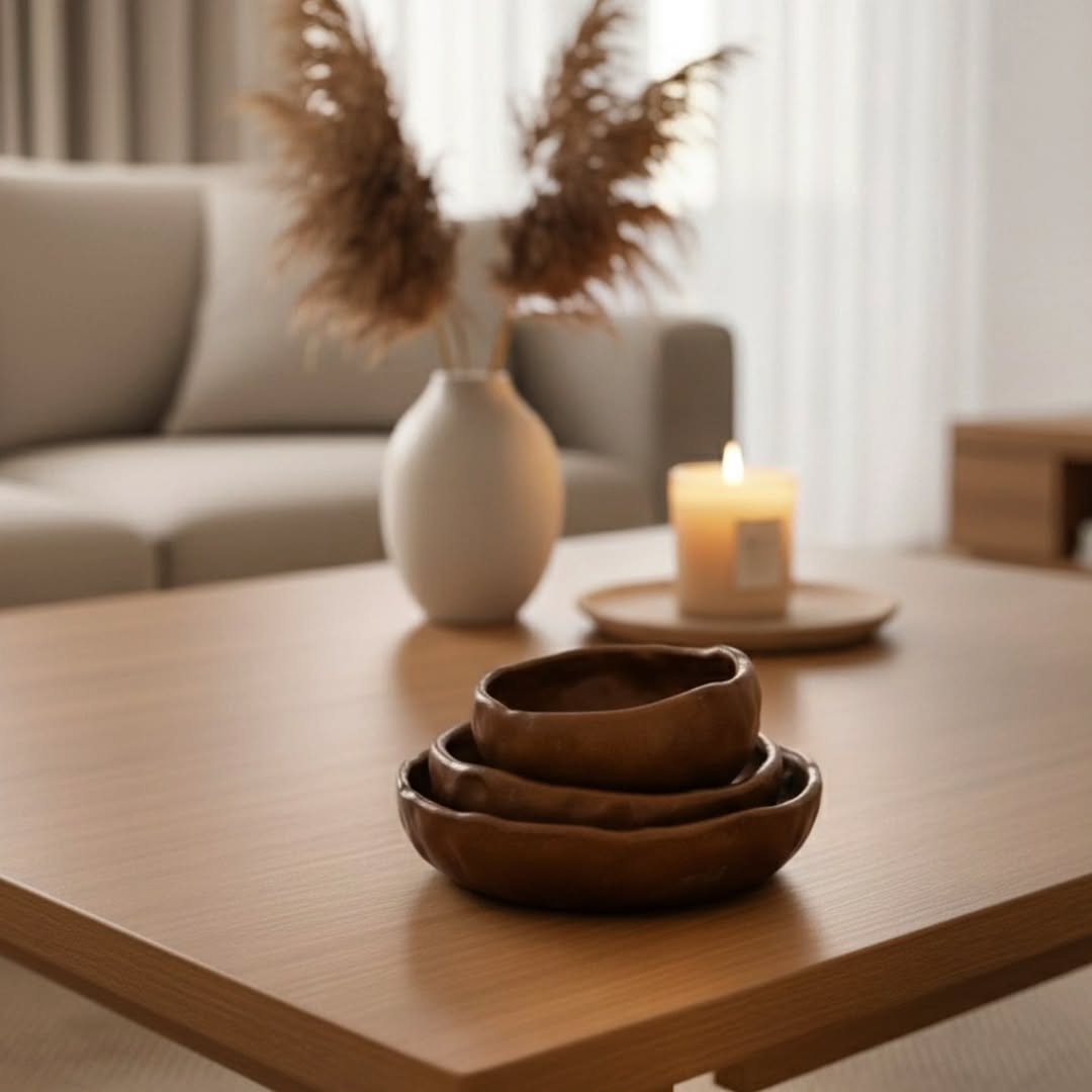 ظروفی با طراحی ارگانیک و ساخت سنگ مصنوعی که هم جلوهای لوکس دارند و هم کاملاً کاربردی هستند. فرمهای دفرمه، بافت طبیعی و رنگ گرم چوب باعث میشود حتی در سادهترین چیدمانها هم چشمگیر باشند.