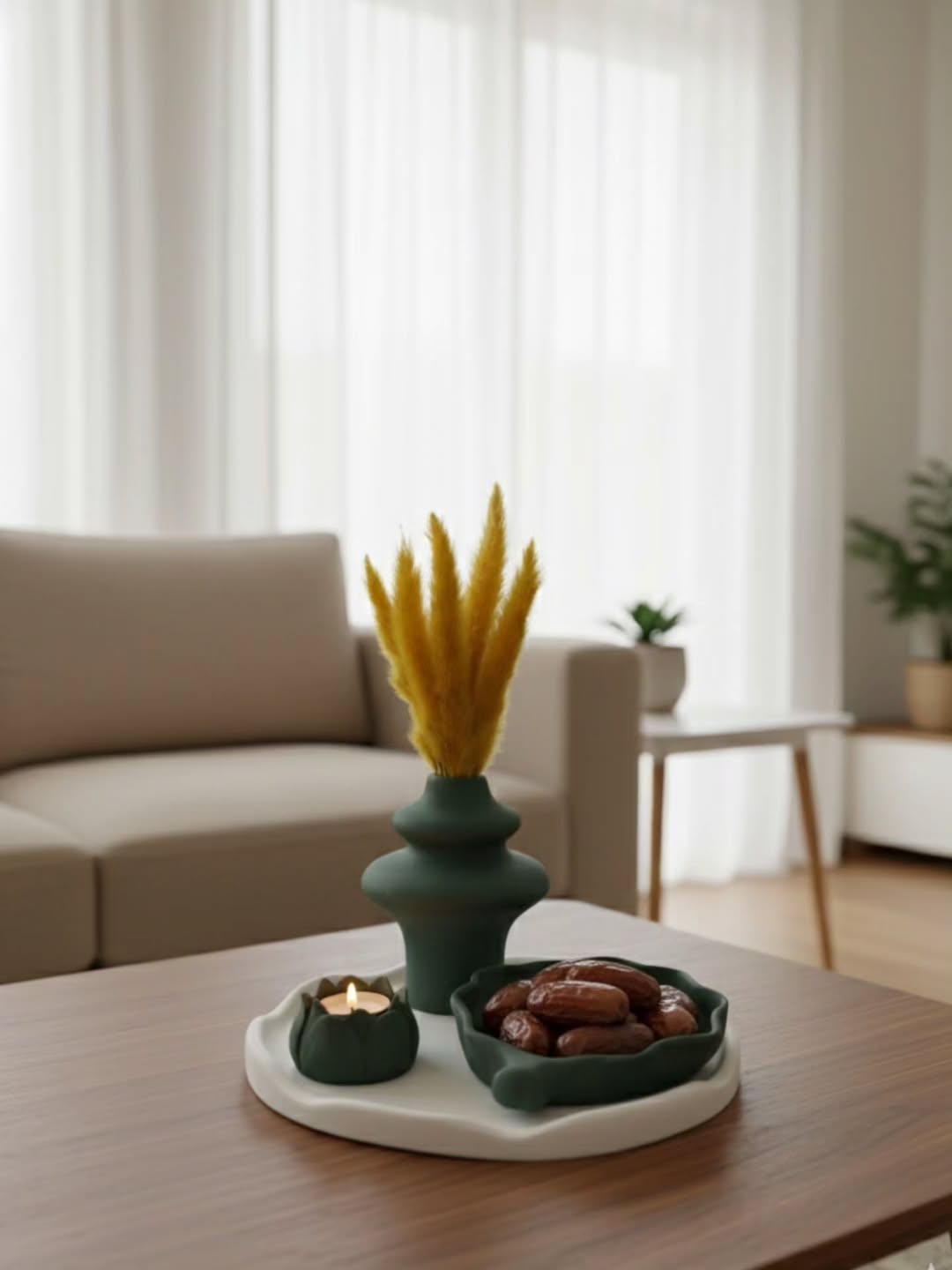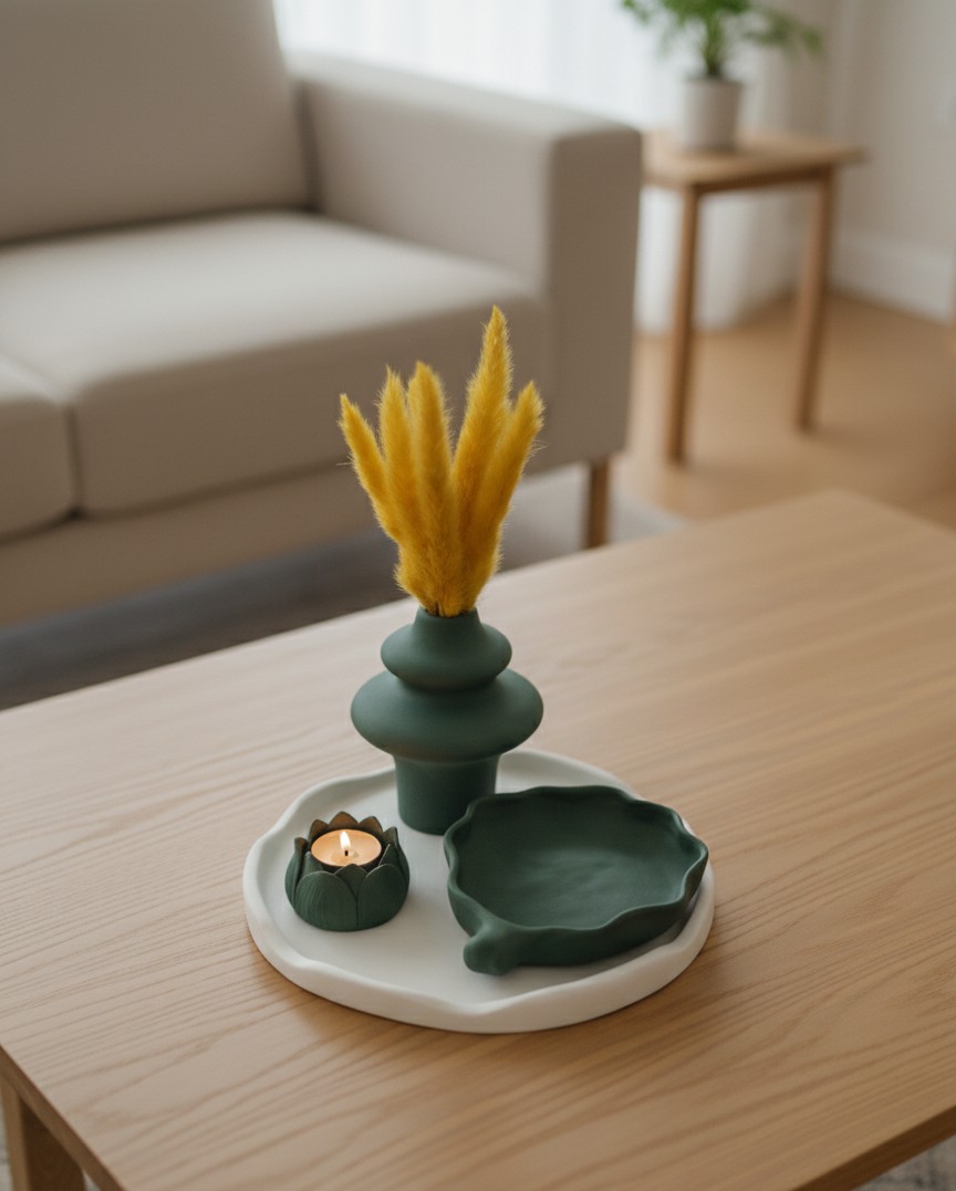 ست دکوری روی میز جلو مبلی خاص ترکیب گلدان، ظرف دفرمه و جای وارمر برای ایجاد یک هارمونی ساده و شیک در فضای نشیمن.